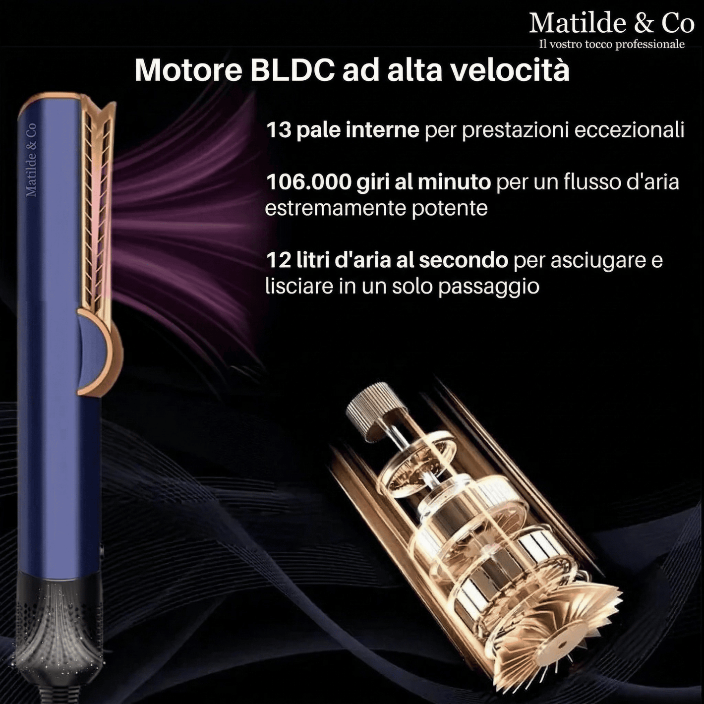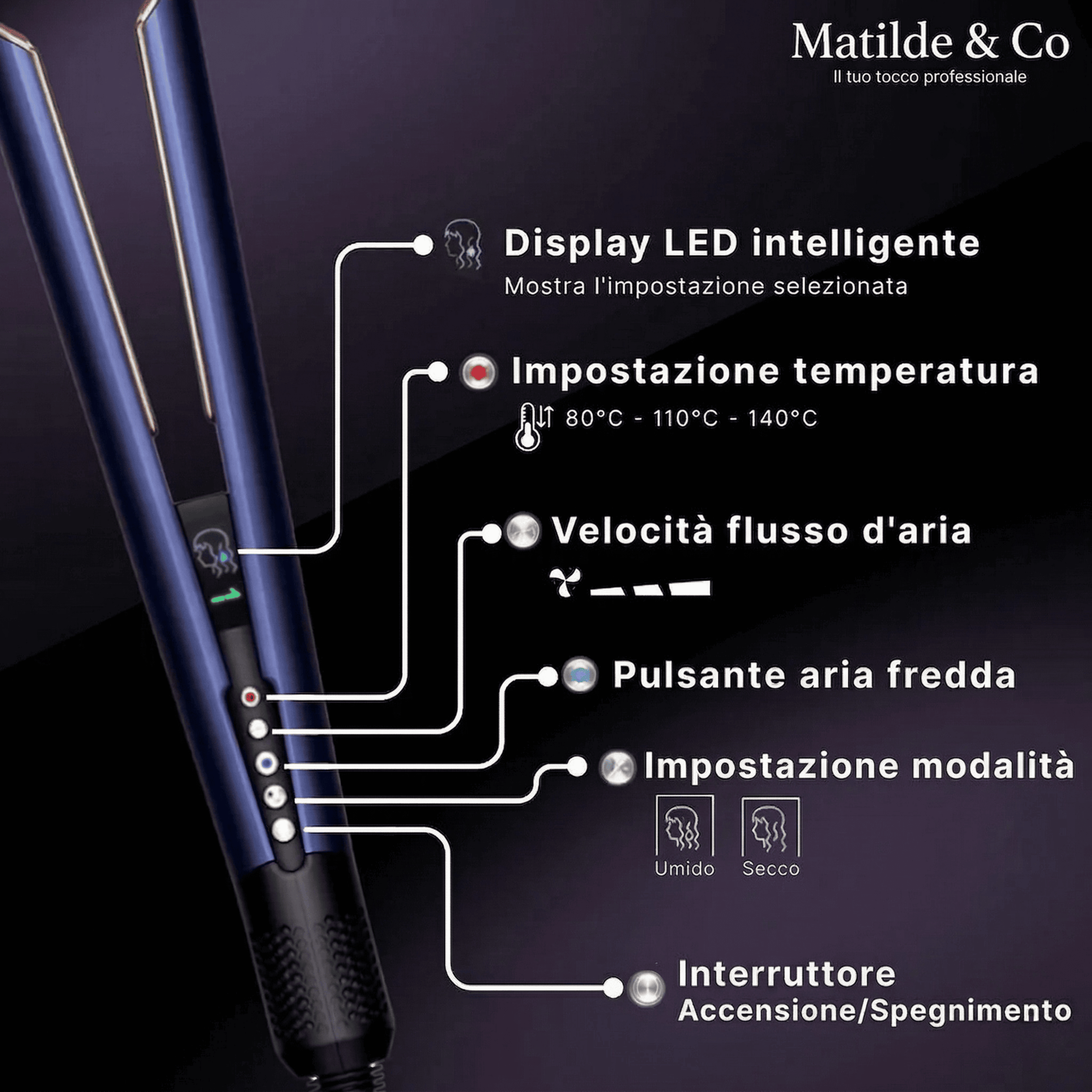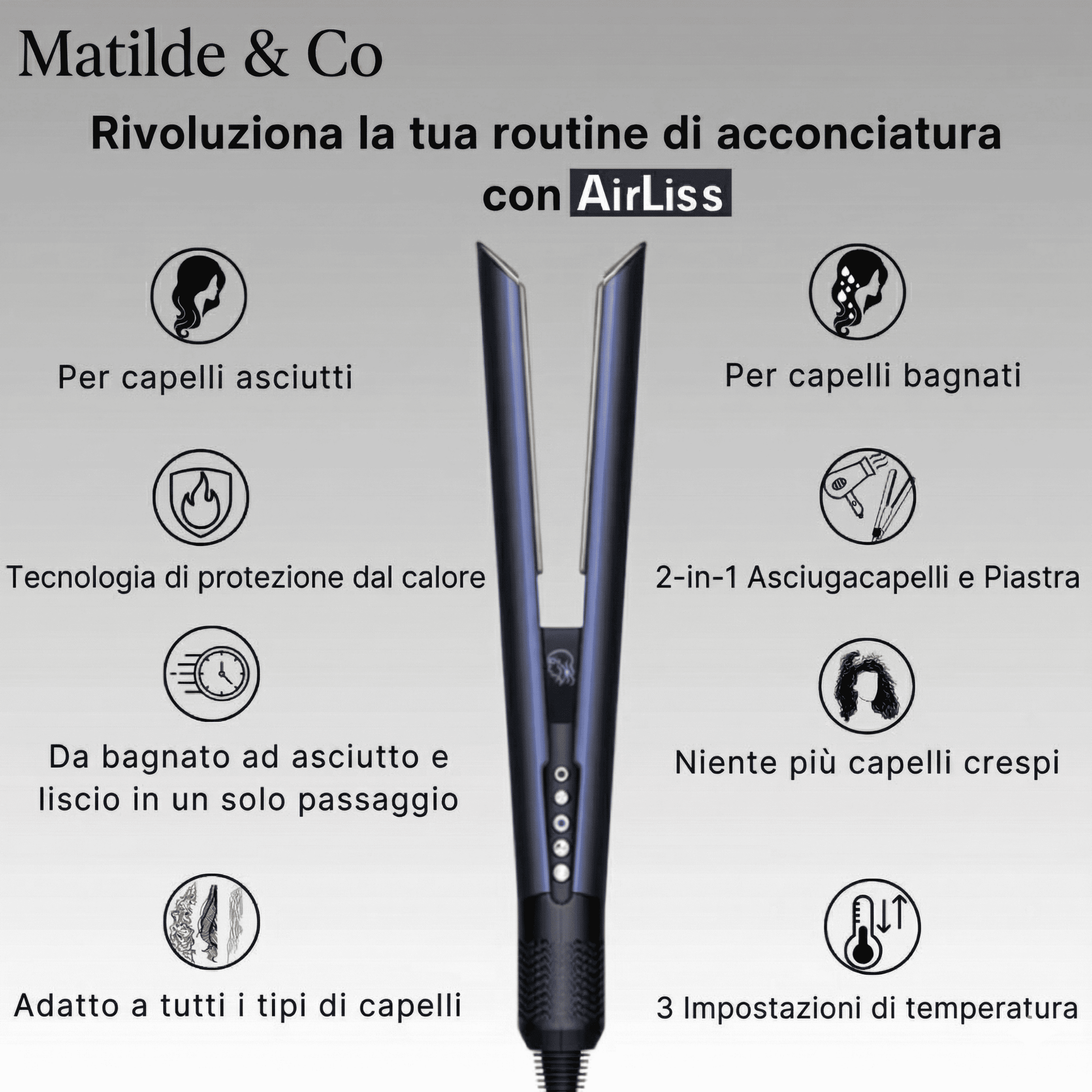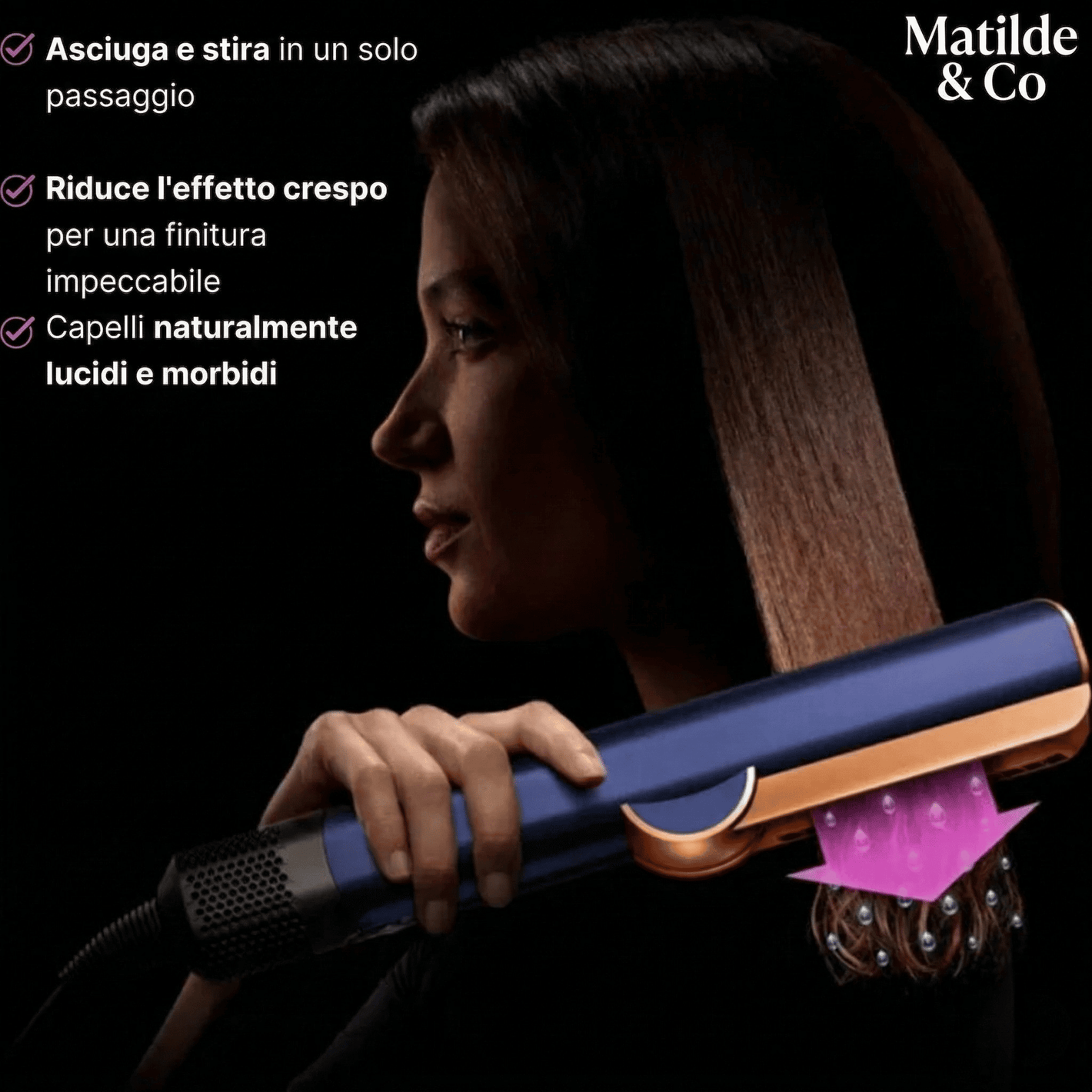 Matilde & Co - SetaFlow™ kombinerar en hårtork och en plattång i en enda enhet, vilket ger dig en snabb och skonsam styling utan värmeskador – perfekt för alla hårtyper. Med en kraftfull digital motor (106 000 varv/min), ett precist luftflöde på 11,9 l/s och intelligent temperaturkontroll (30 mätningar per sekund) erbjuder denna 2-i-1 plattång med fönfunktion ett innovativt alternativ till den traditionella plattången. Det varma luftflödet verkar på håret i en optimal vinkel på 45° och slätar ut det försiktigt under torkningen – för mjukt och glänsande hår, utan frissighet. Idealisk för den som vill ha ett effektivt, tidsbesparande stylingverktyg som skyddar hårets hälsa.